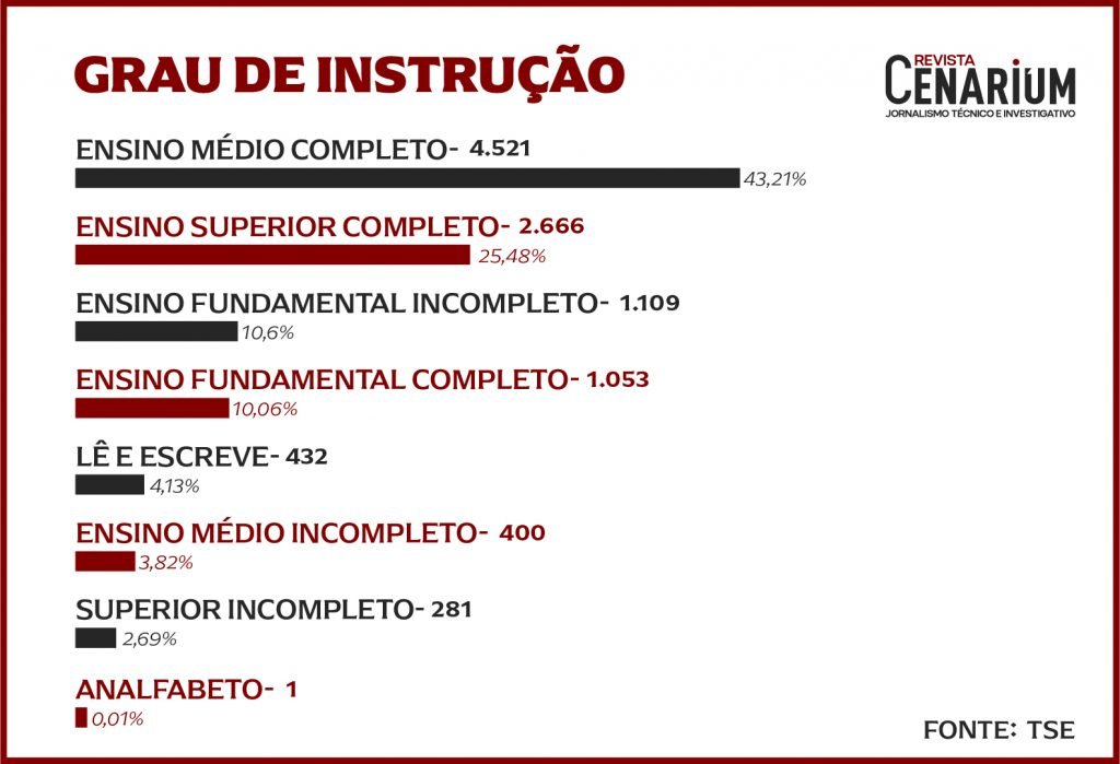 Segundo dados divulgados pelo TSE, dos 10.463 candidatos às prefeituras e câmaras municipais do Estado, 4.521 possuem ensino médio completo. Seguidos de 2.666 postulantes ensino superior completo.