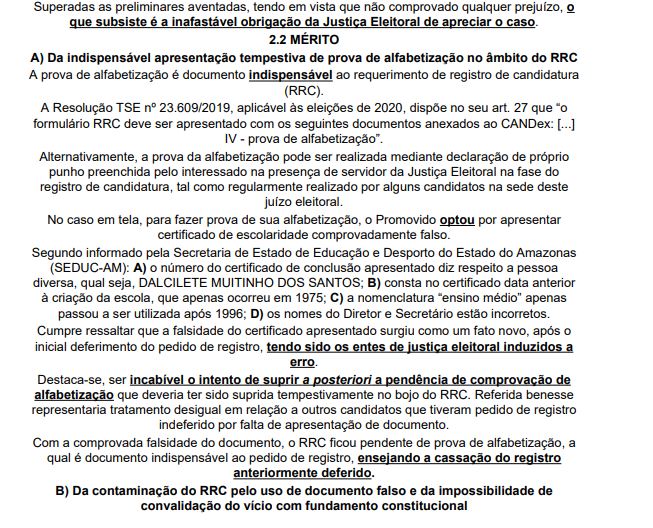 Segundo o documento, a defesa do prefeito eleito, nenhum momento negou a falsidade do certificado de conclusão do ensino médio apresentado como prova de alfabetização do Requerimento de Registro de Candidatura (RRC) de Martins. “Sua defesa limitou-se a alegar que o Poder Judiciário Eleitoral não pode examinar inelegibilidades de ofício e que a via eleita seria inadequada”, descreve o documento.