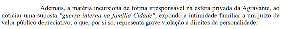 A magistrada destacou que a matéria, além de imputar condutas ilícitas, invadiu a esfera privada da empresária ao expor uma suposta “guerra interna na família Cidade”, o que representa “grave violação a direitos da personalidade”.