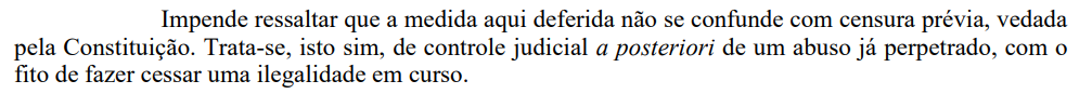 A desembargadora também ressaltou que a medida judicial “não configura censura, mas sim o controle judicial de um abuso já praticado, com o objetivo de evitar danos irreparáveis à honra da agravante”.