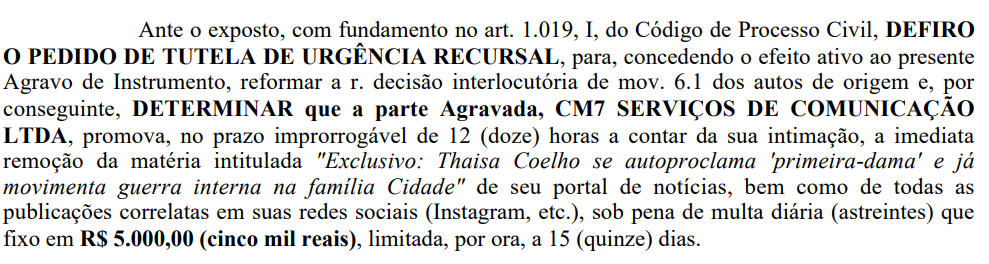 Já na segunda decisão (0010633-74.2025.8.04.9001), a desembargadora determinou a retirada de outra publicação intitulada “Exclusivo: Thaisa Coelho se autoproclama ‘primeira-dama’ e já movimenta guerra interna na família Cidade“, com alegações que a agravante “comprou mídia” e “inventou cargo”.