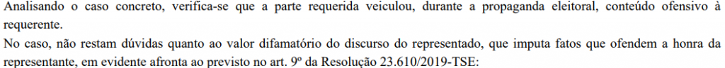 “Analisando o caso concreto, verifica-se que a parte requerida veiculou, durante a propaganda eleitoral, conteúdo ofensivo à requerente“, pontuou a juíza. “No caso, não restam dúvidas quanto ao valor difamatório do discurso do representado, que imputa fatos que ofendem a honra da representante“.