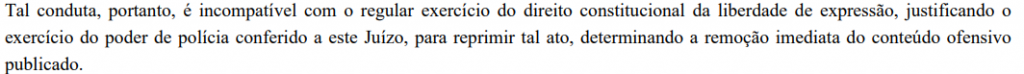 “Tal conduta, portanto, é incompatível com o regular exercício do direito constitucional da liberdade de expressão, justificando o exercício do poder de polícia conferido a este Juízo, para reprimir tal ato, determinando a remoção imediata do conteúdo ofensivo publicado“, disse.