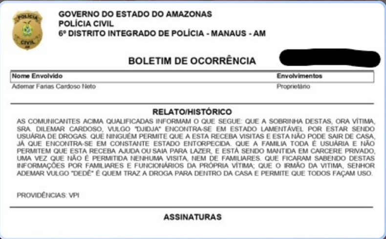Boletim de Ocorrência (B.O) registrado no dia 24 de abril deste ano, no 6° Distrito Integrado de Polícia (DIP), em Manaus, mostra que familiares denunciaram o cárcere privado da ex-item do Boi-Bumbá Garantido. Tias de Djidja apontaram o irmão Ademar Cardoso como fornecedor de drogas.