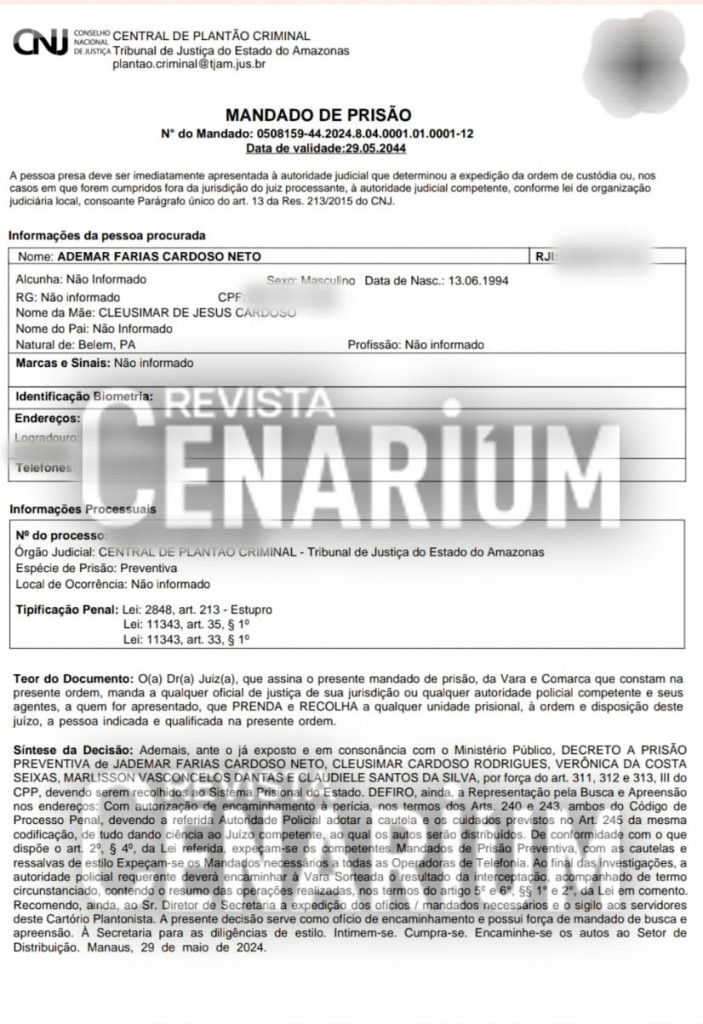 O mandado foi expedido nessa quarta-feira, 29, pela central de plantão criminal do TJAM, ao qual a REVISTA CENARIUM teve acesso com exclusividade. Além da prisão, a Justiça determinou a busca e apreensão na residência dos familiares da ex-item do Boi Garantido.
