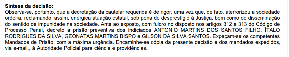 O mandado de prisão contra os acusados foi assinado às 13h57 desta quarta-feira, 12, pela juíza Juliana Guimarães Ornellas, do Tribunal de Justiça de São Paulo (TJ-SP). A prisão de um dos envolvidos foi decretada com base no artigo 121 da Lei 2.848, que trata do crime de homicídio.