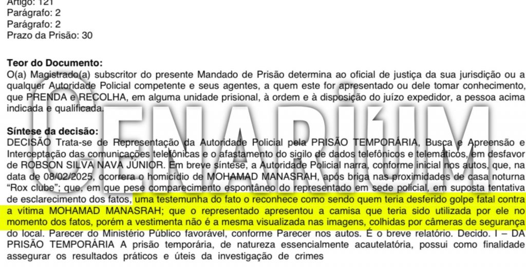 “Uma testemunha do fato o reconhece como sendo quem teria desferido golpe fatal contra a vítima MOHAMAD MANASRAH; que o representado apresentou a camisa que teria sido utilizada por ele no momento dos fatos, porém a vestimenta não é a mesma visualizada nas imagens, colhidas por câmeras de segurança do local”, diz trecho da decisão.