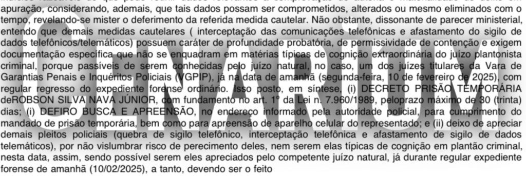 Ele, no entanto, deixou de decidir sobre a interceptação das comunicações telefônicas e a quebra do sigilo de dados telefônicos/telemáticos, por entender que o deferimento das medidas não são “típicas de cognição em plantão criminal”. VEJA TRECHO: