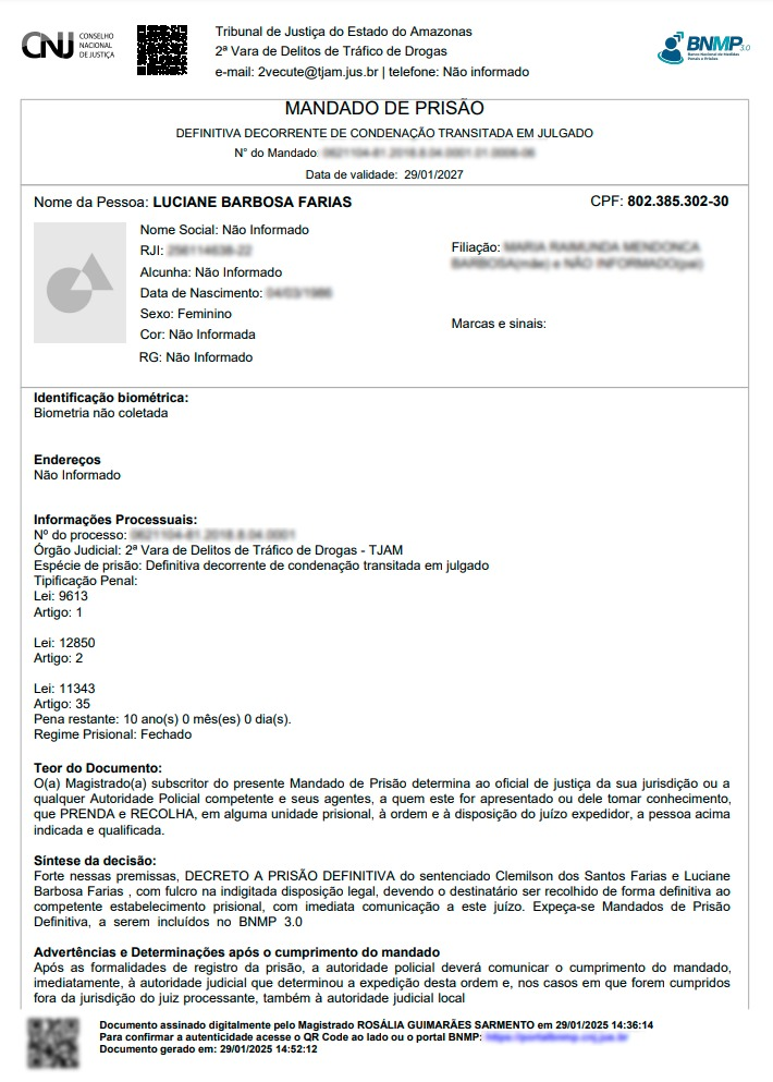 MANAUS (AM) – O Tribunal de Justiça do Amazonas (TJAM), ordenou a prisão definitiva de Luciane Barbosa Farias, que ficou conhecida nacionalmente após ser recebida pelos secretários do Ministério da Justiça e Segurança Pública (MJSP), em 2023. Ela é esposa de Clemilson dos Santos Farias, apontado pelo Ministério Público do Amazonas (MP-AM), como integrante de uma organização criminosa no Estado.