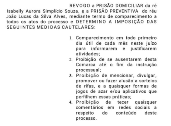 Sem apontar as razões para revogação das prisões, a magistrada impõe medidas cautelares como: o comparecimento obrigatório em juízo, no primeiro dia útil de cada vez; proibição de se ausentar de Manaus até o fim do processo; proibição de fazer ou divulgar rifas ou qualquer jogo de azar; e proibição de mencionar, nas redes sociais, o processo em tramitação.
