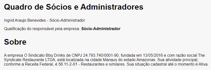 Em pesquisa, é possível constatar que a empresa com nome fantasia “The Syndicate Restaurante LTDA” tem como sócia-administradora Ingrid Araujo Benevides.