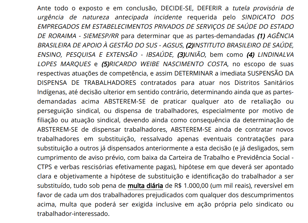 Na liminar, o magistrado proíbe os órgãos e gestores citados de promover novas demissões ou substituições de trabalhadores vinculados aos Dsei Leste e Yanomami. Também está proibido a prática de qualquer ato de retaliação ou perseguição sindical contra os profissionais e contra o sindicato que representa a categoria.