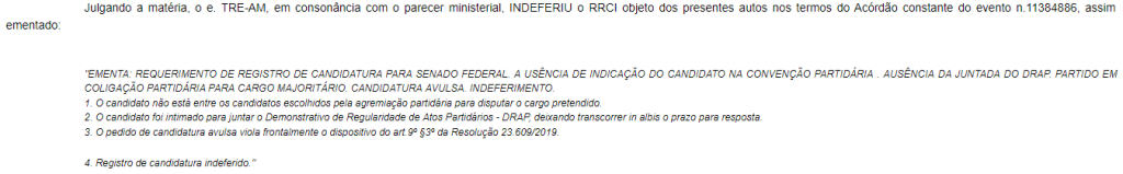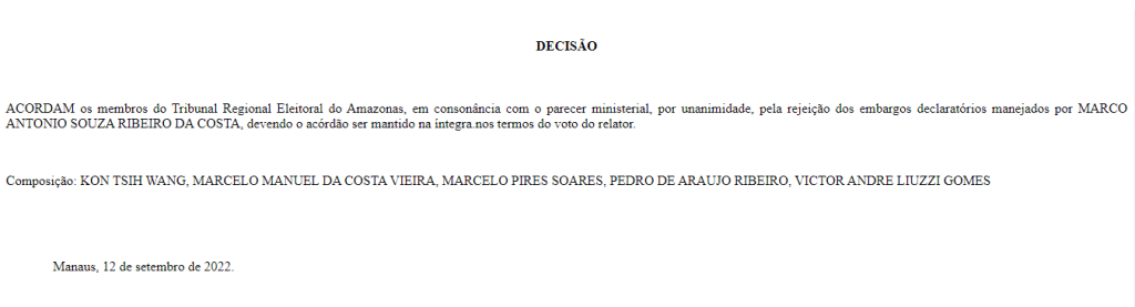 Na decisão, os membros do Tribunal Regional Eleitoral do Amazonas (TRE-AM) decidiram, por unanimidade, pela rejeição dos embargos declaratórios manejados pelo político, devendo o acórdão ser mantido na íntegra.