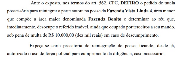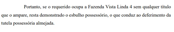 “Lado outro, o requerido não demonstrou sua posse justa e de boa-fé. Isso porque, ao contrário do alegado na peça de bloqueio, na respectiva certidão de matrícula, não consta o genitor do autor como proprietário da Fazenda Vista Linda 4, cuja posse constitui objeto do litígio”, diz trecho da decisão.