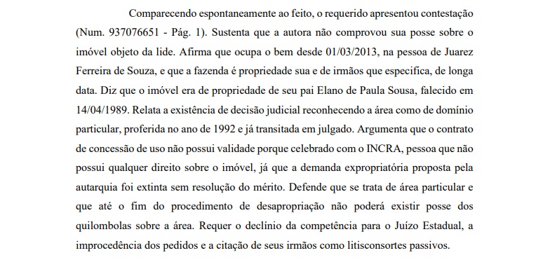 Em defesa, Juvelan apresentou contestação e sustentou que ocupa o território desde 2013, na posse de Juarez Ferreira de Sousa, e que a fazenda é de propriedade sua e de irmãos, além de relatar a existência de decisão judicial reconhecendo a área como de domínio particular, proferida em 1992 e já transitada em julgado. No documento, o agropecuarista também defende que se trata de área particular e que, até o fim do procedimento de desapropriação, não poderá existir posse dos quilombolas sobre o lugar.
