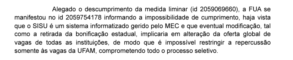O posicionamento do Ministério da Educação (MEC) foi crucial para a suspensão da liminar e liberação das matrículas, quando a entidade argumentou que seria impossível a retirada dos aprovados via bonificação na Ufam.