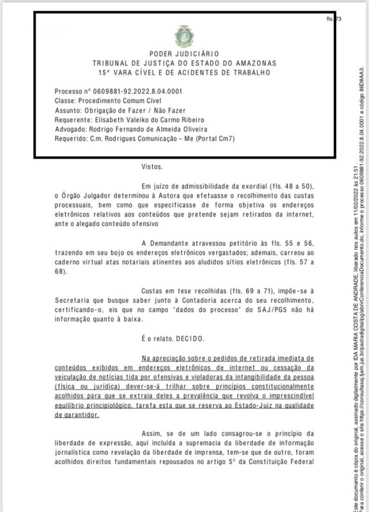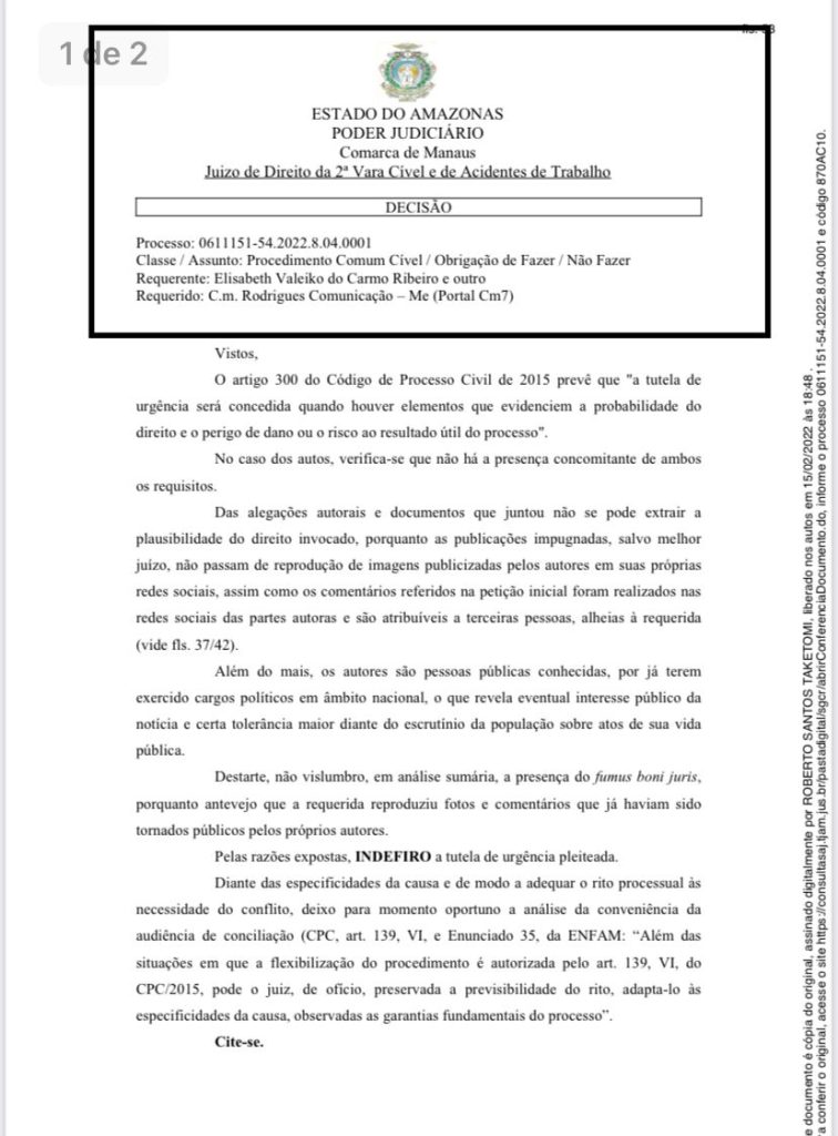 Leia também: Justiça do AM obriga dona do portal CM7 a retirar do ar ataques contra a ex-primeira-dama de Manaus Elisabeth Ribeiro