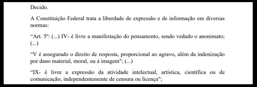 Na ação impetrada, Any Margareth defende que Cileide Moussallem e o blog CM7 teriam “ultrapassado os limites da liberdade de imprensa e de expressão, veiculando ‘mentiras'”. O juiz cita os dispositivos da Constituição Federal que regem o direito à liberdade de expressão quando usufruídos de forma responsável e ética.