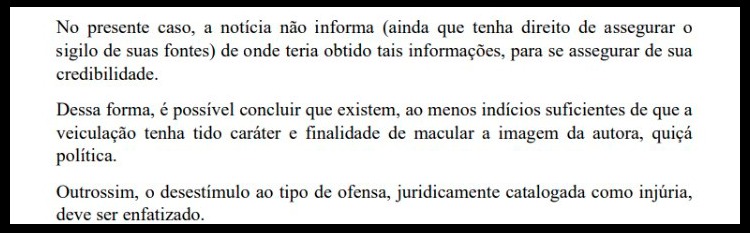 veiculação tenha tido caráter e finalidade de macular a imagem da autora, quiçá política”. “Outrossim, o desestímulo ao tipo de ofensa, juridicamente catalogada como injúria, deve ser enfatizado”, adiciona ele no documento.