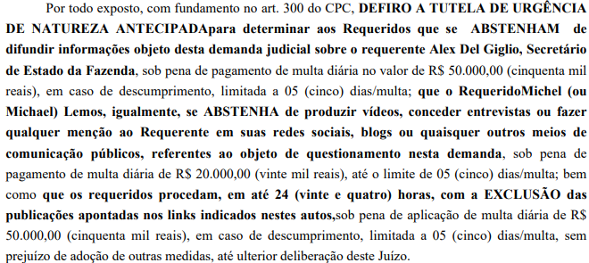 O magistrado determinou que os réus se abstenham de divulgar informações relacionadas ao conteúdo da ação, com aplicação de multa diária em caso de descumprimento. Michael Lemos foi especificamente proibido de produzir vídeos ou declarações públicas envolvendo o requerente, sob pena de multa. Foi fixado também prazo de 24 horas para a exclusão das postagens apontadas.
