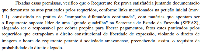 De acordo com o magistrado, as informações divulgadas pelos citados têm potencial de causar danos à imagem do titular da Sefaz-AM, que requereu a tutela de urgência, e que a veiculação dos materiais “extrapolam o direito constitucional de liberdade de expressão, violando o direito de imagem e honra do requerente perante à sociedade, preenchendo, assim, o requisito da probabilidade do direito alegado”. Para Francisco de Queiroz, as publicações mostram que o “posicionamento e a manifestação de opinião dos citados com intuito claramente de macular a imagem” de Alex Del Giglio. Veja trecho:
