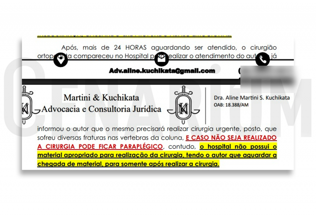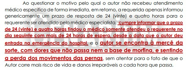 O documento, ao qual esta reportagem teve acesso, também argumenta que a unidade desobedeceu um prazo dado inicialmente para o “atendimento médico específico de forma imediata”, que era de 24 horas. “O autor se encontra à mercê da sorte, com dores que não passam nem à base de morfina, e sentindo a perda dos movimentos das pernas“, diz. Veja trecho da petição obtida com exclusividade pela CENARIUM: