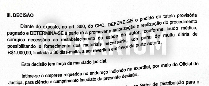 O magistrado plantonista na Central de Plantão Cível da Comarca de Manaus acatou o argumento da defesa de Jucimar Martini e ordenou que a Hapvida autorizasse e realizasse a cirurgia para o restabelecimento da saúde do homem de 36 anos de forma imediata, sob pena de multa diária de R$ 1 mil. A decisão judicial também cita o fornecimento de materiais necessários para a realização do procedimento cirúrgico que a empresa alegava não possuir. Veja trecho da decisão: