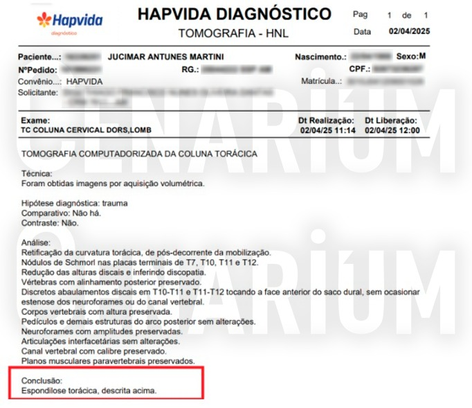 Jucimar Martini deu entrada na unidade de saúde com várias fraturas em vértebras da coluna, na manhã de quarta-feira, 3, após sofrer um acidente de trabalho, e segue internado neste sábado, 5. Duas horas após chegar à unidade de saúde, um exame de tomografia — procedimento de imagem de raio-X computadorizado, o qual a CENARIUM teve acesso — apontou fraturas nas vértebras do paciente, além de “espondilose torácica”, que é um tipo de artrite que afeta as articulações e os discos da parte superior das costas. Veja documento: