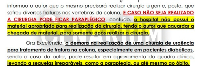 Após a avaliação do médico especialista, pontua a defesa, o profissional apontou que Jucimar precisa realizar uma cirurgia urgente, sob risco de ficar paraplégico. “A demora na realização de uma cirurgia de urgência para o tratamento de fratura na coluna, especialmente em pacientes diabéticos, como é o caso do autor, pode resultar no agravamento do quadro clínico, levando a sequelas irreparáveis, como a paraplegia, ou até mesmo ao óbito”, diz outro trecho da petição ingressada na Justiça. Veja: