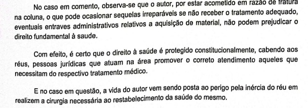 Na decisão, Paulo Fernando Feitoza aponta que Jucimar, “por estar acometido em razão de fratura na coluna, eventuais entraves relativos à aquisição de materiais não podem prejudicar o direito fundamental à saúde“. De acordo com a determinação, o paciente pode ter sequelas irreparáveis se não receber o tratamento adequado. O juiz também cita que, “no caso em questão, a vida do paciente vem sendo exposta pela inércia do réu em realizar a cirurgia necessária ao restabelecimento da saúde do mesmo”. Veja outro trecho: