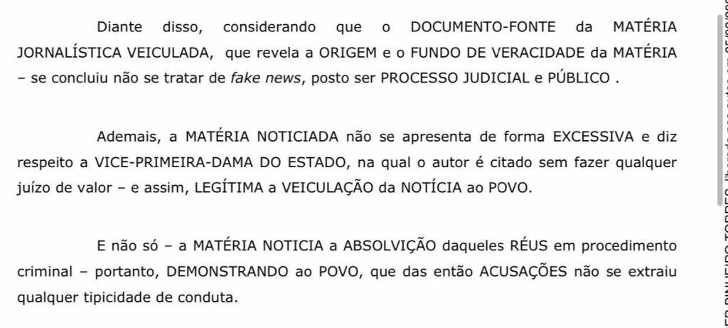 O juiz destaca que o documento utilizado como fonte para a reportagem “revela a origem e o fundo de veracidade da matéria”, concluindo, assim, “não se tratar de fake news“. Diante do exposto, o magistrado julgou improcedentes os pedidos e declarou a extinção da ação.