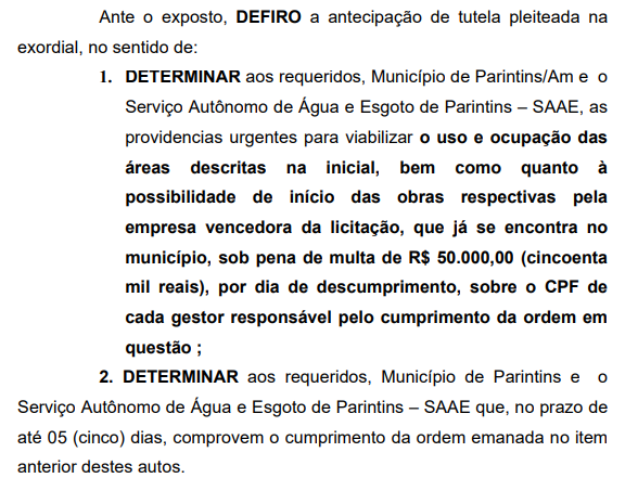 A magistrada mencionou que a gestão de Bi Garcia também deve viabilizar o início das obras pela empresa vencedora da licitação, que já se encontra no município. A decisão estabeleceu, ainda, um prazo de cinco dias para que a Prefeitura de Parintins e o Serviço Autônomo de Água e Esgoto (SAAE) comprove o cumprimento da ordem judicial, sob pena de multa de R$ 50 mil no Cadastro de Pessoas Físicas (CPF) dos “gestores responsáveis pelo cumprimento da ordem em questão”.
