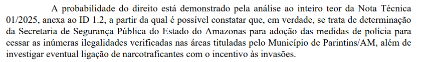 “A análise ao inteiro teor da Nota Técnica 01/2025, anexa ao ID 1.2, a partir da qual é possível constatar que, em verdade, se trata de determinação da Secretaria de Segurança Pública do Estado do Amazonas para adoção das medidas de polícia para cessar as inúmeras ilegalidades verificadas nas áreas tituladas pelo Município de Parintins/AM, além de investigar eventual ligação de narcotraficantes com o incentivo às invasões”, diz trecho da decisão.