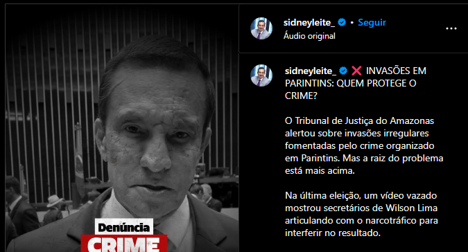 MANAUS (AM) – O juiz Leoney Figliuolo Harraquian, da 2ª Comarca da Fazenda Pública de Manaus, determinou, nesta sexta-feira, 21, que o deputado federal Sidney Leite (PSD/AM) exclua um vídeo, no qual ele afirma, sem apresentar provas, que integrantes do Governo do Amazonas têm ligação com o crime organizado no município de Parintins (AM), localizado a 369 quilômetros de Manaus. O magistrado deu prazo de cinco dias para a exclusão do conteúdo com “informação inverídica”, sob pena de multa diária de R$ 5 mil.