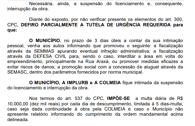 Na decisão, o juiz Moacir Pereira Batista registrou que “com forte provas de vídeos e fotos, vislumbro os referidos requisitos, mormente pelo risco de novos danos e por ter sido omisso o município e a Implurb em fiscalizar ou não observar no projeto da obra ao conceder o licenciamento.”