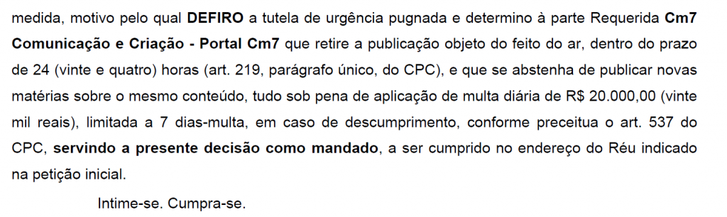 Em sua decisão, o magistrado determinou ainda que a matéria fosse retirada de qualquer outro meio em que tenha sido publicado sob pena de multa diária de R$ 5 mil.