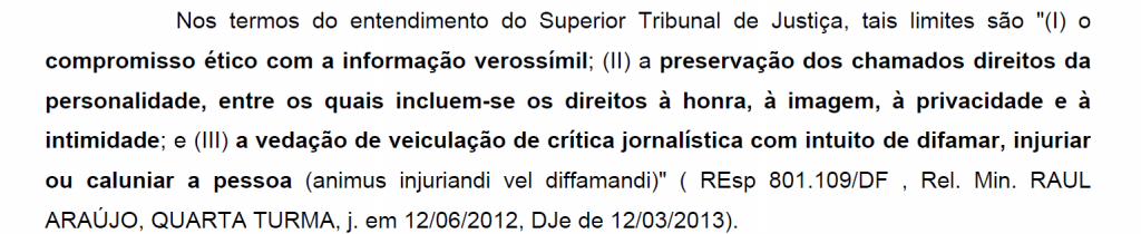 De acordo com as determinações da magistrada, a publicação ultrapassou os limites da liberdade de imprensa, que não é absoluta e deve ser “balizada pela responsabilidade, não servindo como fundamento à prática de ato ilícito“. Neste ponto, a magistrada cita três limites.