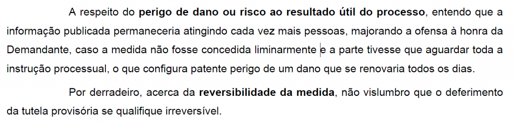 Em relação à decisão sobre Thaisa Coelho, a juíza entendeu que há indícios de que a honra da professora foi atingida indevidamente. “A respeito do perigo de dano ou risco ao resultado útil do processo, entendo que a informação publicada permaneceria atingindo cada vez mais pessoas, majorando a ofensa à honra da demandante, caso a medida não fosse concedida liminarmente e a parte tivesse que aguardar toda a instrução processual, o que configura patente perigo de um dano que se renovaria todos os dias“, consta na liminar.