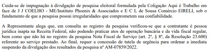 “A Representante alega que, em consulta ao registro da pesquisa, verificou-se que a contratante é pessoa jurídica inapta na Receita Federal, não podendo praticar atos de operação bancária e da vida fiscal regular, bem como que não há no registro da pesquisa Nota Fiscal de Serviço (art. 2º, § 8º, da Resolução 23.600) referente ao serviço prestado. Ao final, requer a concessão de tutela de urgência para ordenar a imediata suspensão da divulgação dos resultados da pesquisa N° AM-07859/2022“, consta um trecho do documento.