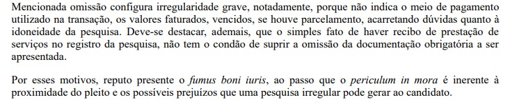 Em outro trecho da decisão judicial consta, ainda, que foi apresentado um recibo como comprovante de pagamento da pesquisa, quando deveria ser uma nota fiscal. Além disso, o recibo não informa dados financeiros de pagamento, o que é exigido por lei, o que segundo o juiz é uma omissão “configurada como irregularidade grave”, justamente por não apontar o meio de pagamento e despertar dúvidas quanto à veracidade da pesquisa.