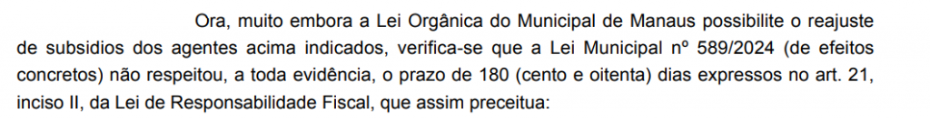 “Embora a Lei Orgânica do Municipal de Manaus possibilite o reajuste de subsidios dos agentes acima indicados, verifica-se que a Lei Municipal nº 589/2024 (de efeitos concretos) não respeitou, a toda evidência, o prazo de 180 (cento e oitenta) dias expressos no art. 21, inciso II, da Lei de Responsabilidade Fiscal”, que assim preceitua”, destaca a decisão.