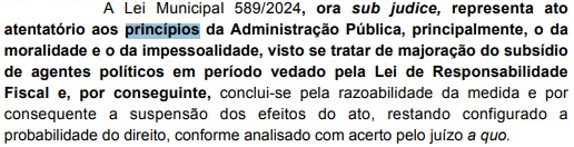 Em argumentação, a Prefeitura alegou que a medida liminar ameaça a folha de pagamento e defendeu a legalidade do reajuste. No entanto, a relatora ressaltou que o texto foi aprovado fora do prazo permitido e que a suspensão evita prejuízos ao erário.
