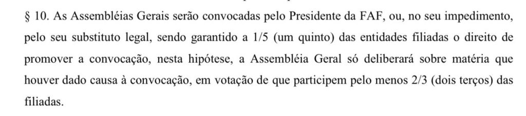 “Está bem claro. O poder máximo da federação é a Assembleia Geral. No [artigo 10, o Estatuto] diz que o presidente pode chamar, no seu impedimento, substituto legal, sendo garantido aos filiados convocar Assembleia Geral. Simples, foi o que aconteceu. Tudo embasado no Estatuto e dentro da lei”, reforçou Rodrigo Novaes.
