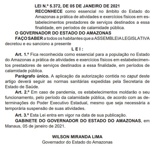 MANAUS – A lei nº 5.372, de 5 de janeiro de 2021, estabelecida pelo Projeto de Lei nº 194/2020 do deputado estadual Josué Neto (Patriota), foi publicada no Diário Oficial do Estado, o qual reconhece como serviço essencial o funcionamento de academias no período de calamidade pública no Amazonas.