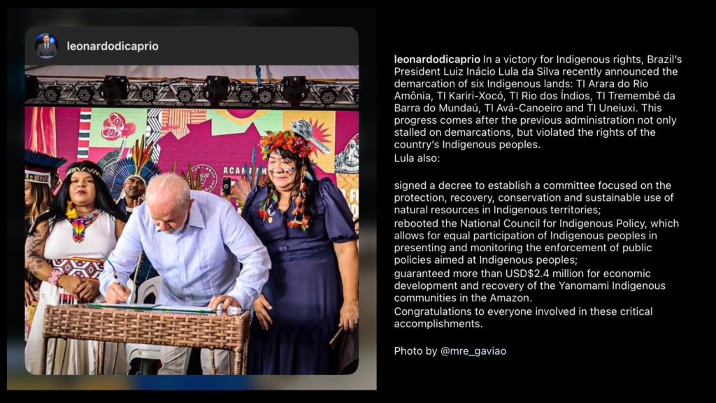 MANAUS – O ator e estrela de Hollywood Leonardo DiCaprio, conhecido por ter uma atuação ativista na causa ambiental e já ter se posicionado em defesa da Amazônia em pé e das causas indígenas, usou o seu perfil na rede social Instagram, neste domingo, 28, para relembrar seis terras indígenas (TIs) que tiveram decreto de demarcação assinado pelo presidente Luiz Inácio Lula da Silva (PT), durante o Acampamento Terra Livre (TL), que aconteceu no mês de abril, em Brasília.