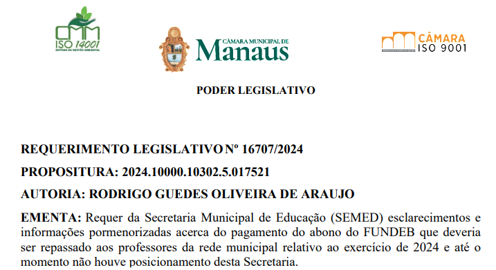 Se aprovado, a Semed prestaria esclarecimentos sobre o pagamento do abono do Fundeb a professores da rede municipal de ensino, relativo ao exercício de 2024, o que não houve manifestação até o momento. Nessa quarta-feira, o governador do Estado, Wilson Lima (União Brasil), confirmou o rateio aos profissionais da educação no âmbito estadual, e o prefeito de Manaus foi cobrado do pagamento.