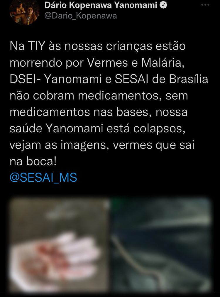 “Na TIY [Terra Indígena Yanomami], as nossas crianças estão morrendo por vermes e malária, DSEI- Yanomami e Sesai de Brasília não cobram medicamentos. Sem medicamentos nas bases, nossa saúde Yanomami está em colapso, vejam as imagens, vermes que sai da boca“, desabafou na quarta-feira, 20, Dário Yanomami, no Twitter.