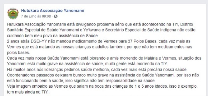 Em nota publicada nas redes sociais, no último dia 7 de julho, a Hutukara Associação Yanomami fez o primeiro relato sobre a situação sanitária. Para a organização, o Distrito Sanitário Especial de Saúde Yanomami e Ye’kwana (Dsei-YY) e a Secretaria Especial de Saúde Indígena (Sesai) não estão cuidando bem da população indígena na assistência de saúde.