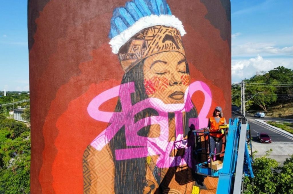 Líder indígena é homenageada em grafite no Centro Cultural, em Manaus