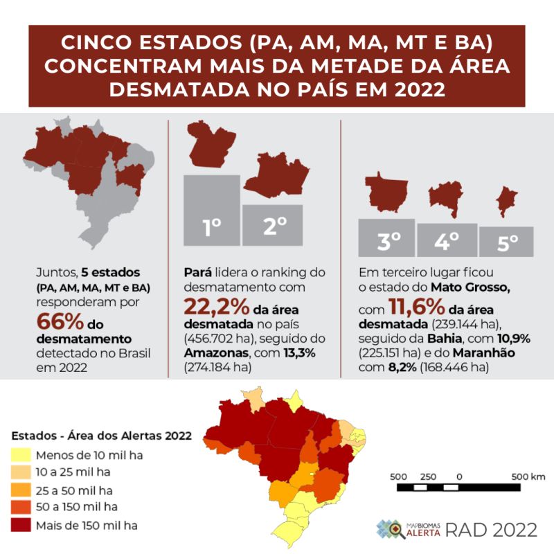 De acordo com os dados do Relatório Anual de Desmatamento (RAD2022) produzido pelo MapBiomas, no ano passado, a área desmatada no Brasil aumentou em relação a 2021. O Estado do Pará lidera o ranking do desmatamento, com 22,2% da área desmatada no País (456.702 ha), seguido pelo Amazonas, com 13,33% (274.184 ha).